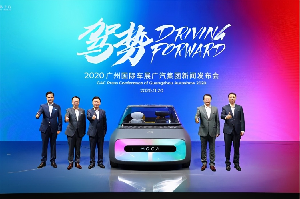 (广汽集团董事长曾庆洪(左三)、广汽集团总经理冯兴亚(右二)、广汽乘用车总经理张跃赛(左二)、广汽研究院院长吴坚(右一)、广汽埃安总经理古惠南(左一)与概念车MOCA合影)