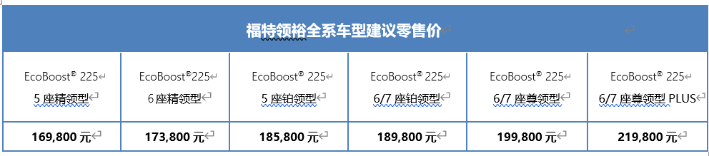 福特领裕充分利用福特品牌在全球SUV市场强大的品牌优势和技术优势,结合中国消费市场的多元化需求,重新定义了中大型家用SUV的产品标杆,为中国消费者提供升级的全家出行体验。