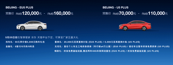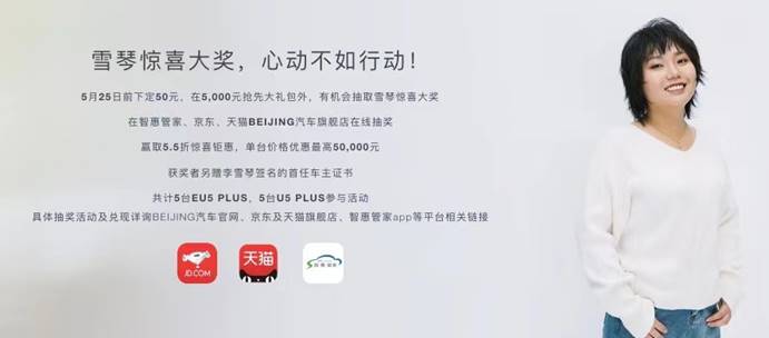 为了让用户轻松享受这两款车型带来的优质出行体验,BEIJING汽车还提供了多重购车尊享方案,5月25日前通过智惠管家APP下定,可享受50元抵5000元购车礼包、0首付0月供0利息金融优惠、至高20000元(EU5 PLUS)/5000元(U5 PLUS)置换补贴、整车终身免费质保、终身免费基础流量等超值好礼,此外,还有机会在智惠管家、京东、天猫三大平台抽取雪琴惊喜大奖,包括5台EU5 PLUS和5台U5 PLUS享售价5.5折惊喜优惠(单台优惠金额至高5万元),以及李雪琴签名的专属车主证书。