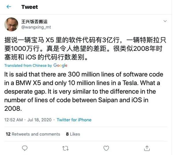 前段时间,美团CEO在个人社交媒体发表了关于特斯拉和宝马的言论,引发了一番口水战。王兴称,“据说一辆宝马X5里的软件代码有3亿行,一辆特斯拉只要1000万行,真是令人绝望的差距,很类似2008年时塞班和iOS的代码行数差别。”王兴所说的数字不一定完全准确,也有业内人士表示,即使宝马X5和特斯拉Model X两款车型使用相同的编程语言,使用同一台计算机语言去实现同一个功能,思路不同的程序员写出的代码差距也很大,何况是两家公司。但不可否认的是,特斯拉在三电技术以及智能化方面,在行业内的确具有很大的优势。