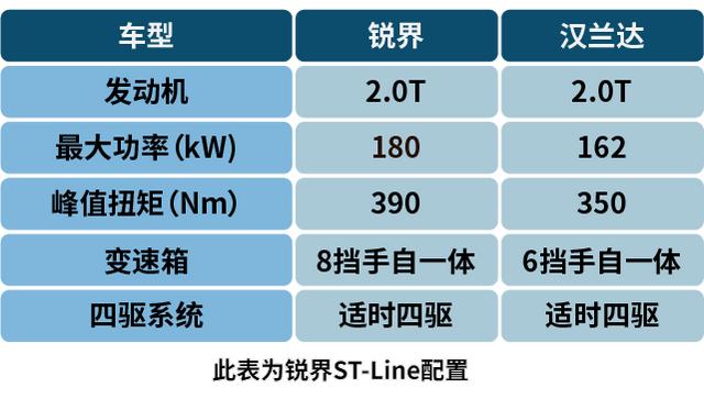 如今的中国市场是汽车消费日益年轻化的市场,他们的汽车消费观也与上一辈有了很大的区别,他们更乐于为自己的喜好买单、追求生活的品质。所以当他们手持足够的购车预算时,希望所买的SUV不仅限于出入代步,更希望在满足基本需求之余,可以有更多的驾控乐趣,毕竟追求速度与激情,是年轻一族内心深处永恒不变的底色。而且笔者在开篇时也提到过,自驾游途中,面对不熟悉的地方,有着更好的动力表现和搭载四驱系统的SUV,能帮助消费者应对各种路况。那么锐界ST-Line和汉兰达这两款SUV在价格相同的情况下,所搭载的动力和四驱表现如何呢?