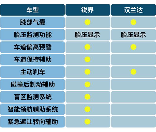 从配置表上可以看到,两者均搭载了6安全气囊、倒车影像、上坡辅助、胎压显示等配置,但在主动安全智能化方面两者各有不同。汉兰达配备的是车道偏离预警系统与主动刹车,整体符合主流水平。不过,笔者认为,无论是平时的市区代步还是假期自驾游,都不可避免地会遇到车多人多的情况,所以对于一款售价接近30万的7座SUV来说,只配备车道偏离预警和主动刹车功能是不够的。