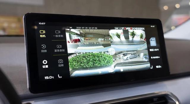 除了上述提到的部分以外,整个几何C的内部就没有太多特别出众的地方了,但有一些地方依旧值得一提,比如12.8英寸的中控屏幕。这块中控屏幕集成了与吉利博越同源的GKUI19吉客智能生态系统(该系统首次搭载至几何品牌汽车上),反应速度较快,显示效果也不错,比如这个倒车影像以及行车记录仪的显示效果都能让人满意。