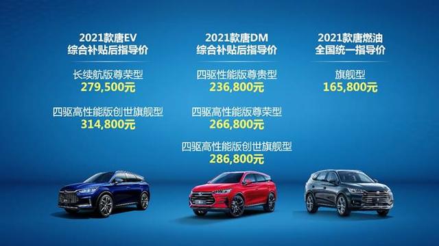 8月16日,“因专业而强大”,旗舰再进化,全球超安全专业智能旗舰SUV——2021款唐隆重上市,共推出燃油版、插电混动版及纯电版的立体式产品矩阵,官方指导价格如下: