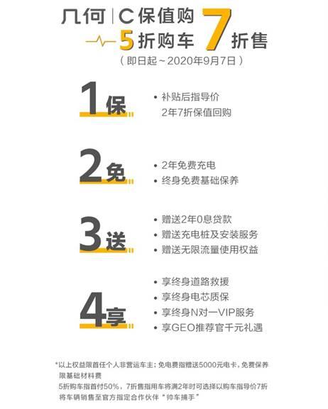 除此以外,几何还推出一系列其他权益,包括2年免费充电和终身免费基础保养;赠送2年0息贷款、赠送充电桩及安装服务、赠送无限流量使用权益;享终身道路救援、享终身电芯质保、享终身N对一 VIP服务、享GEO推荐官千元礼遇等。