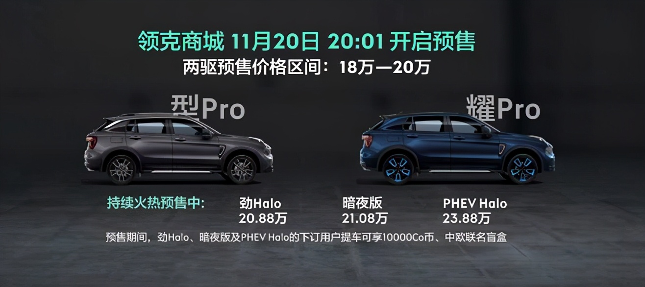 【2020年11月20日】今日,全球新高端品牌领克汽车携旗下全系车型亮相第18届广州国际车展,强大参展阵容彰显领克全面、立体的产品矩阵。同时,领克汽车新全球高端SUV——全新领克01也在广州车展开启全系预售。10月21日,全新领克01在中欧开启同步预售,其中国内预售的三款版型分别是:四驱车型劲Halo、暗夜版以及插电混动车型 PHEV Halo。除上述三款车型外,本次广州车展,全新领克01新增两驱版型,分别为型Pro、耀Pro,预售价格区间为18万-20万元,将于11月20日20:01分在领克商城、领克APP开启线上预订。至此,全新领克01全系车型,均已全部开启预售。