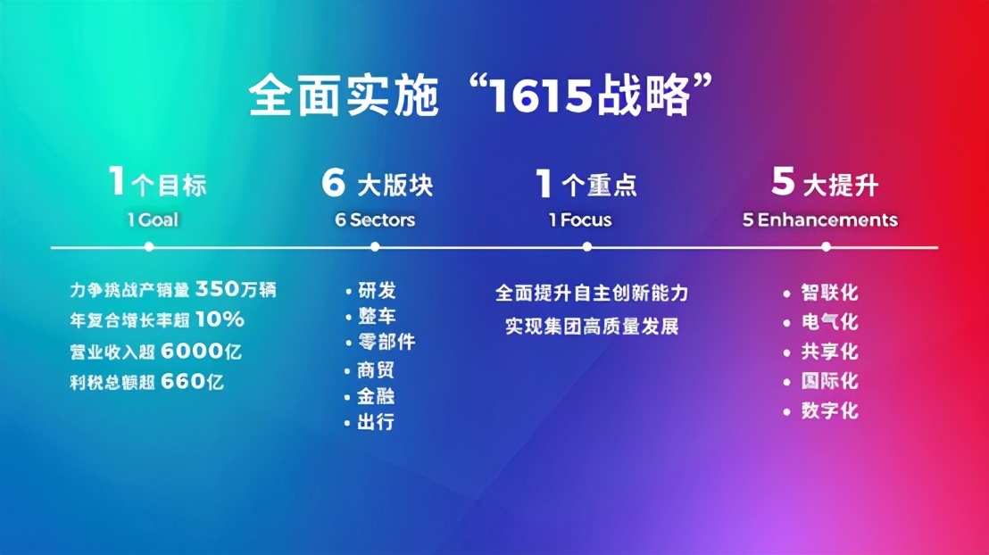 夯实6大板块,做强做实研发、整车、零部件、商贸服务、金融服务和出行服务六大板块;