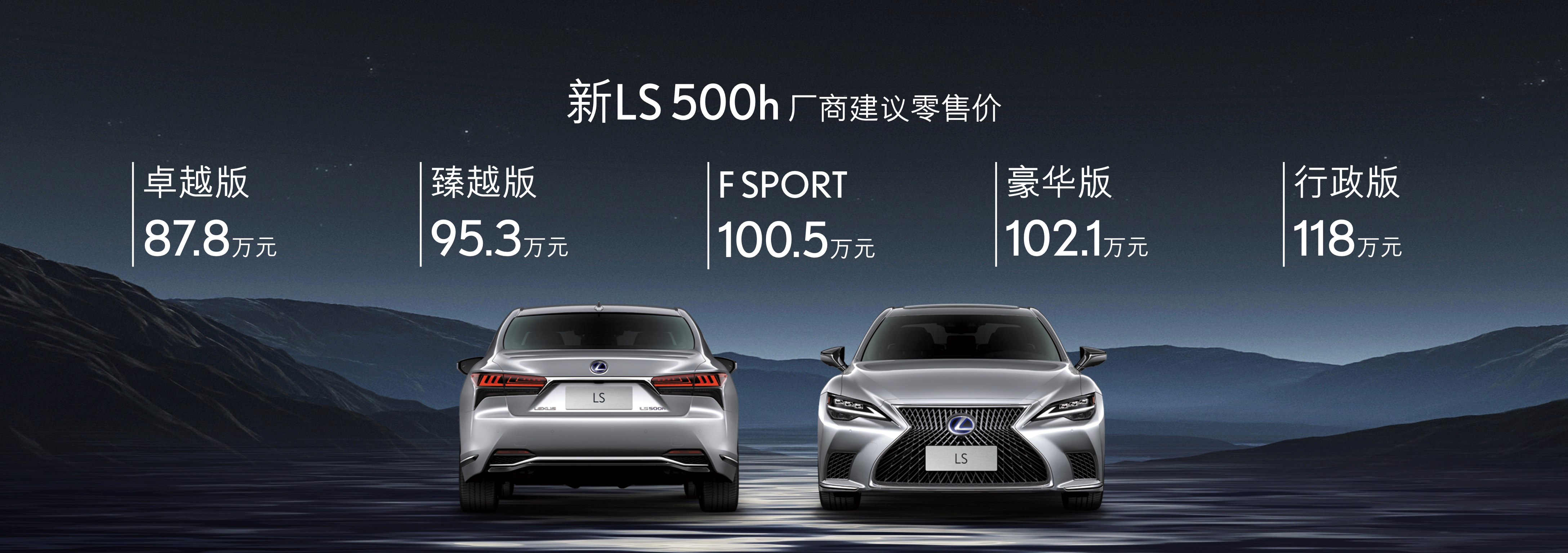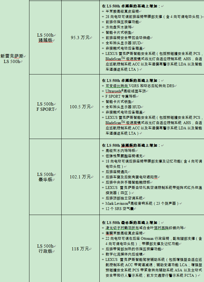新LS共推出5款车型:LS 500h卓越版、LS 500h臻越版、LS 500h F SPORT、LS 500h豪华版和LS 500h行政版,厂商建议零售价为人民币87.8万元-118万元。