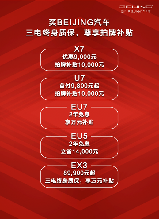 车展期间,凡订购BEIJING汽车燃油车型均可享受1万元拍牌补贴,另可享受高达数千元的现金优惠,购买BEIJING-X7享9000元优惠,BEIJING-U7首付低至9800元起!购买BEIJING汽车精品电动车,不仅可享受1万元购车补贴,还可享2年免息、三电终身质保等超值福利,BEIJING-EX3最低仅需8.99万元,堪称年度入手最佳时机!