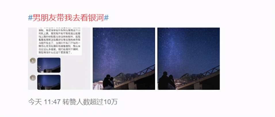 最近一张照片刷爆了全网——男朋友带我去看银河。一个身在北京的男生,为了带心爱的女友看银河,做了很多努力和尝试,终于在红井路完成了最浪漫的星空合影。银河话题一出,一天内转赞人数超过十万,不但冲上热搜,更是点燃了很多人内心深处的星空梦。