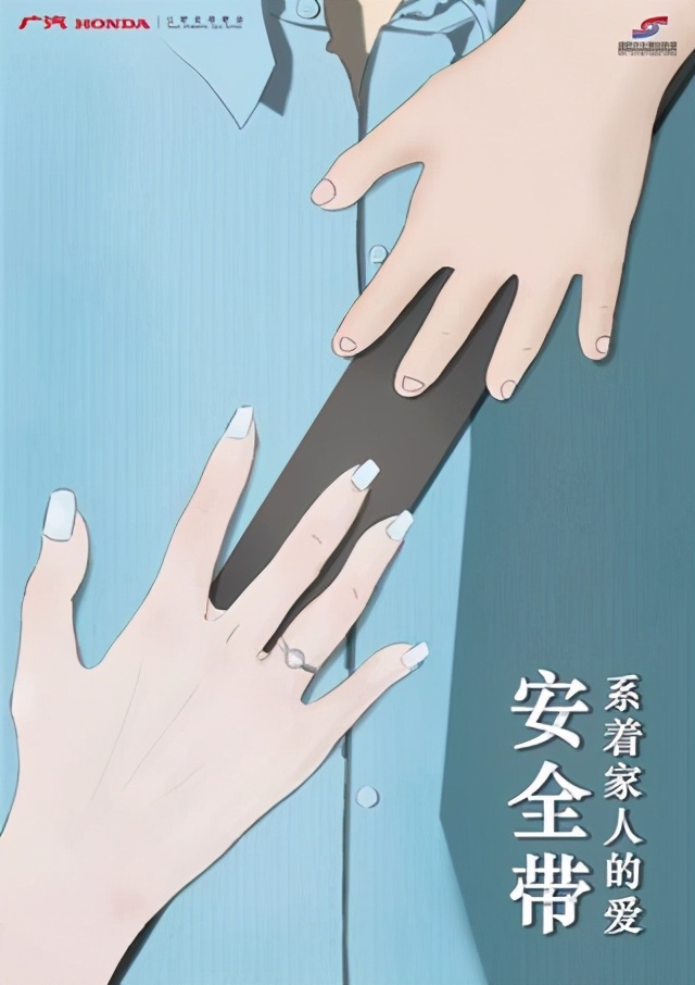 安全带是生命带,可以最大化保护车内人员安全。在公益广告组的《爱的拥抱》作品中,参赛学生从“特别”的视角为我们展示了安全带的重要性。作品中孩子的手和女人的手紧紧拥抱着男人结实的身躯,而这两只手形成的拥抱,恰恰是安全带系紧后的样子,代表着家人的牵挂。作者通过巧妙地将拥抱与安全带结合,告诉我们:安全带,系着家人的爱,为了您和您的家人,出行时请系好安全带。