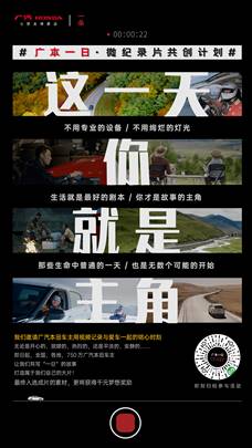 今年7月,广汽本田面向全国车主启动了“广本一日”微纪录片共创计划,以企业“搭台”、用户“唱主角”的形式,征集车主和粉丝共创“一日”的故事。活动以“这一天,你就是主角”为主题,每一位广汽本田车主都可以成为故事的主角。车主们不需用专业的设备,也不需用绚烂的灯光,只要拿起手机记录自己与爱车在一起的时刻,即可参与打造这个“广本粉”专属的“大片”。
