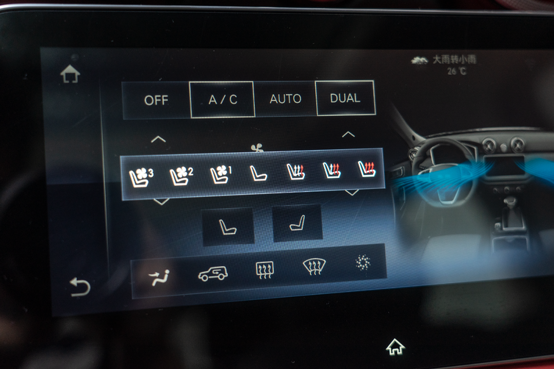 唯一美中不足的是,北京BJ30并没有将这些功能集成在座椅上,而是集成在屏幕上,虽然此举加强了车辆的科技感,但从实用的角度来说,这种做法并不方便。